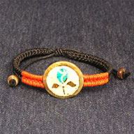 円形のディスクビーズを中心に、コットンコードを用いて編み上げたブレスレットです。テール部を調節することで、脱着は容易です。