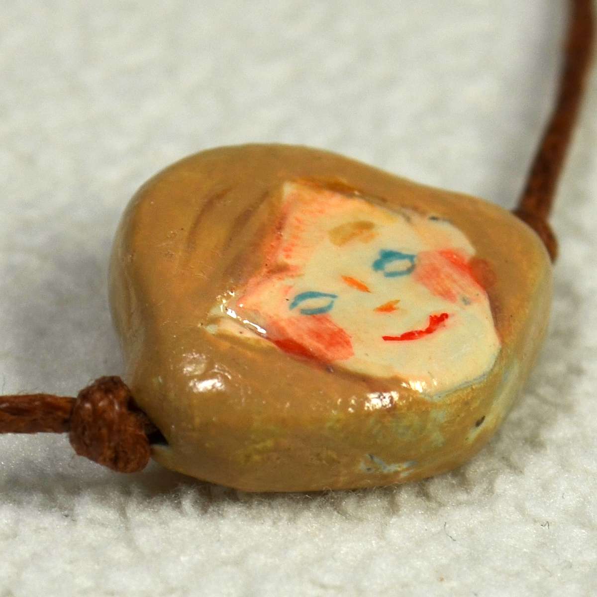 顔の絵が描かれた紙粘土のビーズにコットンコードを通したシンプルなブレスレットです。テール部を操作することで簡単に脱着できます。
