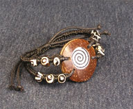 ブレスレット・ディスク[ダブルライン] : BDL007 在庫数 単価 発注数 - + 備考 カートに入れる 価格: 825 円/ 個 (本体価格:750円+税:75円) 重量: 約 11 グラム 表面に模様が描かれている、円盤状のココナツビーズ(直径 27mm x 厚み 8mm) を中心として、その両サイドにストーンビーズが配置され、蝋引きひもで編まれた2本づつの紐で構成されたブレスレットです。テール部の紐を調整することで脱着は容易です。 在庫数 単価 発注数 - + 備考 カートに入れる