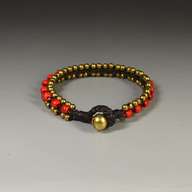 球形のストーンビーズ(直径4mm)が等間隔で中央に配列しています。その両サイドには金メッキされた球形のビーズ(直径約 2mm)が2個ずつ等間隔に配列し、蝋引き紐で編み上げられたブレスレットです。