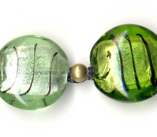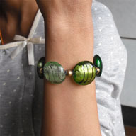 ブレスレット・ガラスプレート : BGP001 在庫数 単価 発注数 - + 備考 カートに入れる 価格: 990 円/ 個 (本体価格:900円+税:90円) 重量: 約 50 グラム 膨らみのある円盤状の半透明で模様があるガラスビーズ(直径約 25mm x 厚み12mm) が5~6個直列に、蝋引き紐で結ばれたブレスレットです。ラスビーズの間には、真鍮製の球形ビーズ(直径6mm)があります。先端部には、鈴型ビーズ(直径 10mm)があり、反対側の先端部の輪に通して装着します。 在庫数 単価 発注数 - + 備考 カートに入れる