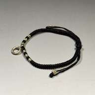ブレスレット・カレン族シルバー : BKR008 在庫数 単価 発注数 - + 備考 カートに入れる 重量: 約 5 グラム 色: 黒色 ドーナツ状のカレン族シルバービーズ(直径10mm 厚さ2mm)が中心に配置されています。蝋引き紐で編み上げられている部分には、カレン族シルバービーズ(長さ2~3mm)が巻き付くように取り付けられている個所が6個所あります。テール部分にも、模様の付いたカレン族シルバービーズ(長さ 4mm)が先の部分に取り付けられています。ブレスレットの手首への装着は、テール部を引っ張ることで簡単に脱着できます。 在庫数 単価 発注数 - + 備考 カートに入れる