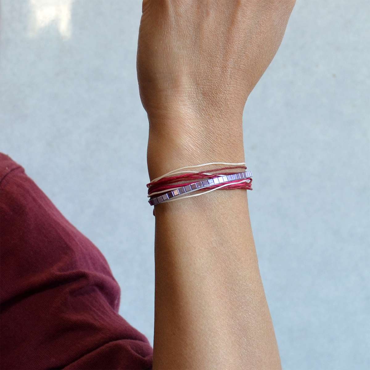 赤紫色・白色・紅色の細い蝋引き紐が10数本と、紫系のメタリックコーティングをした表面の正方形が連なったコード(幅約 3mm 厚み 1mm)で構成されたブレスレットです。