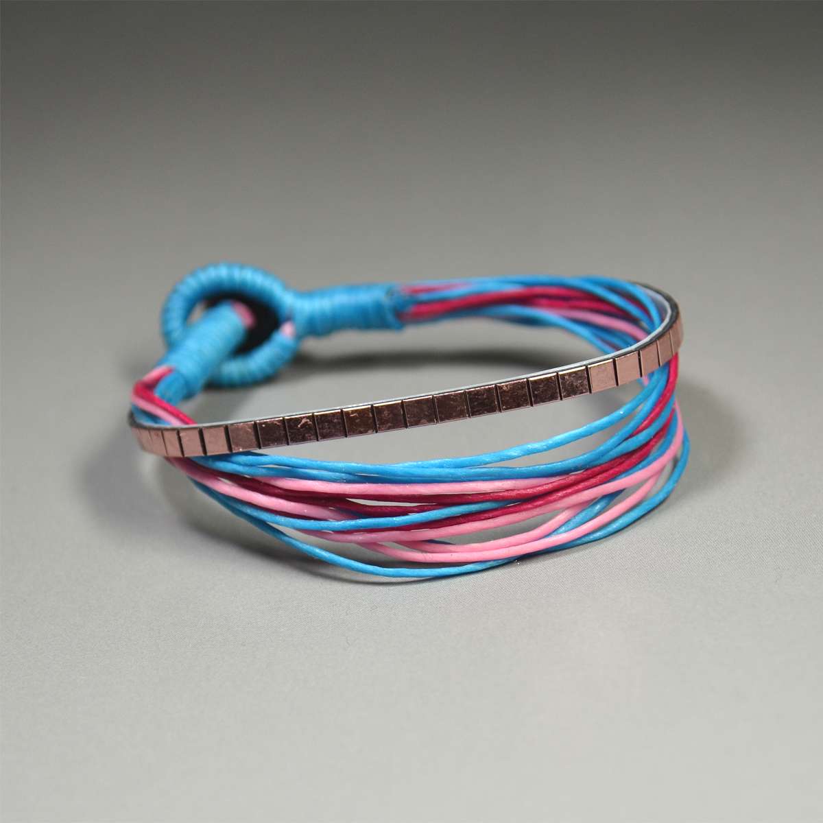浅葱色・砂色・桃色の細い蝋引き紐が10数本と、鉛丹色系のメタリックコーティングをした表面の正方形が連なったコード(幅約 3mm 厚み 1mm)で構成されたブレスレットです。
