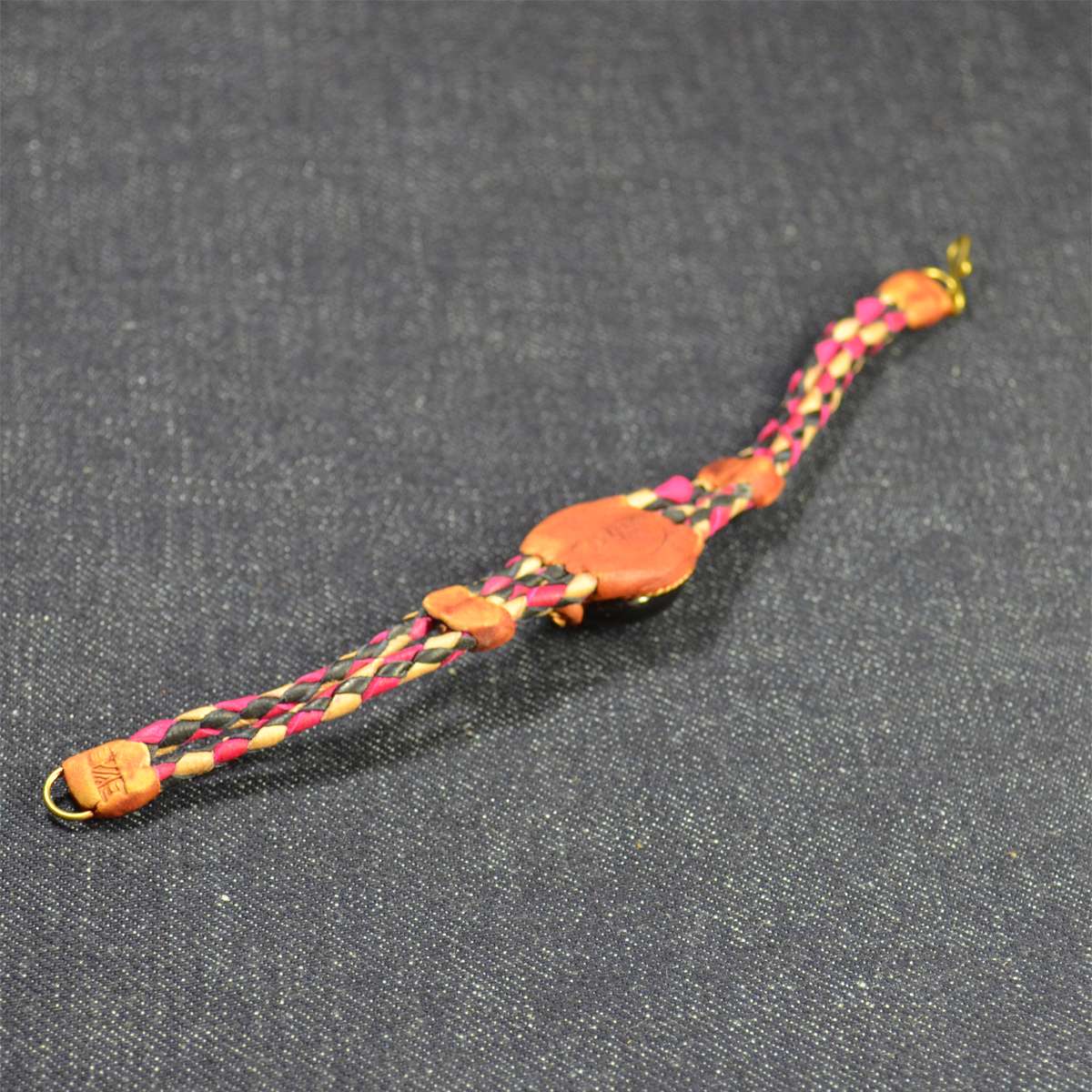 直径約 3mm の柔らかめの革紐2~3本用いたベース上に、中心部に直径約15mm 厚み約12mm のドーム型をしたガラス状のジェムビーズがあり、その前後に装飾があります。