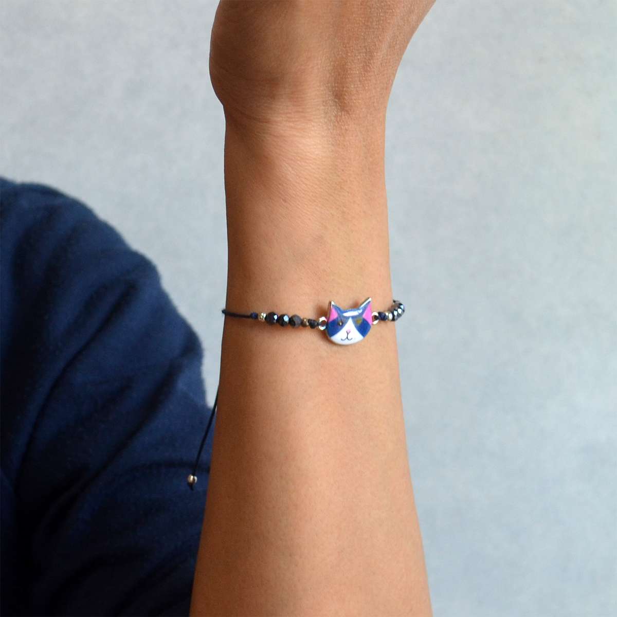 ブレスレット・キャットフェイス : MAT014 在庫数 単価 発注数 - + 備考 カートに入れる 価格: 385 円/ 個 (本体価格:350円+税:35円) 重量: 約 3 グラム 猫の顔をデザインした金属製のビーズを中心として、休憩ストーンビーズ、シルバーカラービーズなどを配置し、シルク紐で結んだブレスレットです。脱着はテール部を操作します。猫の顔のビーズ:16mm x 13mm猫の顔のビーズの裏面には何も描かれていません(銀色の金属色です) 在庫数 単価 発注数 - + 備考 カートに入れる