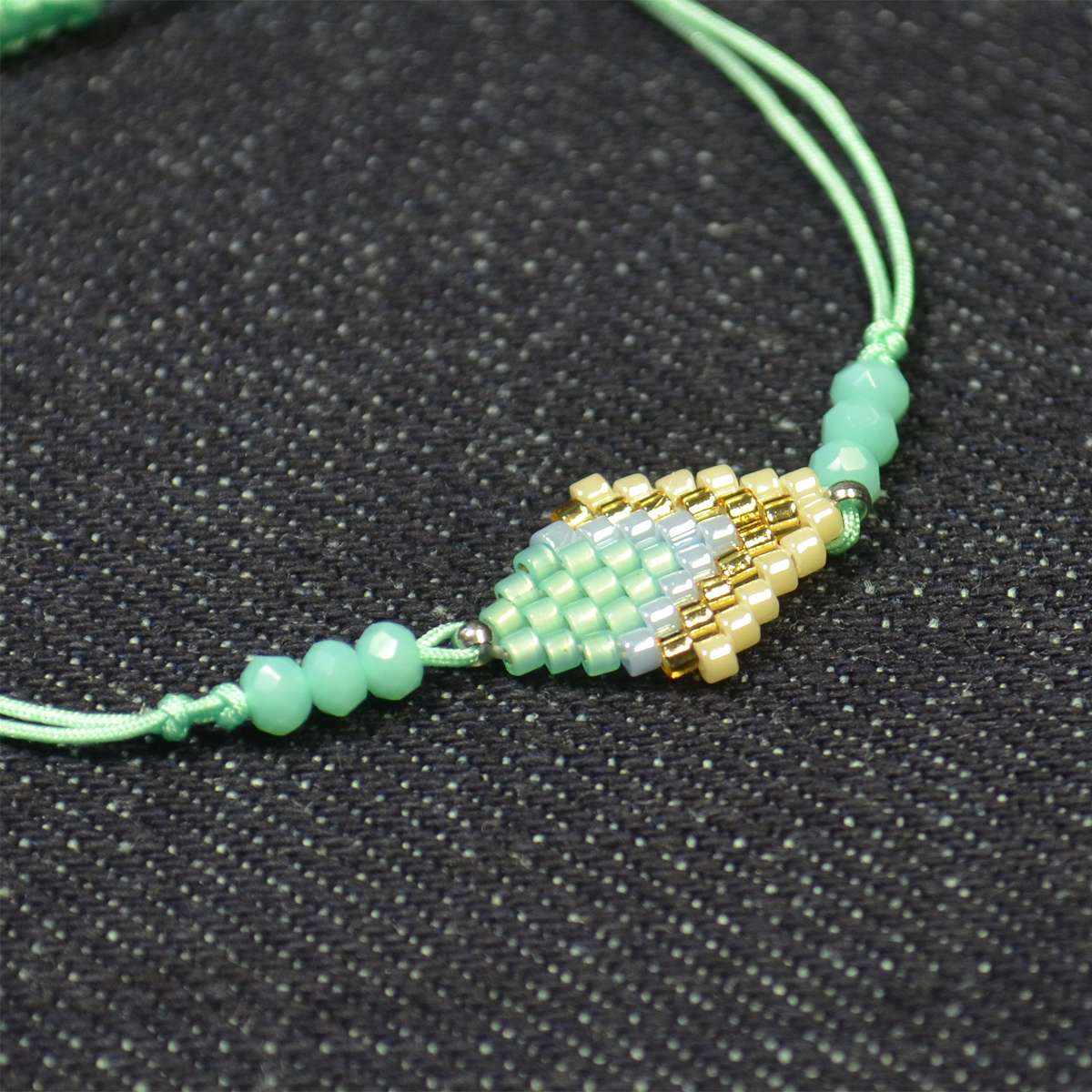 ブレスレット・ミユキビーズ(菱形小) : MYK026 在庫数 単価 発注数 - + 備考 カートに入れる 価格: 550 円/ 個 (本体価格:500円+税:50円) 重量: 約 2 グラム ビーズの直径が約1mmのかなり小さめな「みゆきビーズ」を使い、ひし形を形成するようにビーズを配置し、両サイドに角がある球場のビーズを複数個配置し、シルク紐で結んだブレスレットです。テール部を操作することにより、脱着は簡単です。ひし形の部分:長さ 17mm 高さ:11mmビーズの連なっている部分の長さ:約33mm 在庫数 単価 発注数 - + 備考 カートに入れる