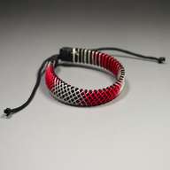 人工革の側面にある歯車の歯のような凸凹に色がついた糸をかけて、クロス模様が描かれたブレスレットです。