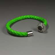 小さなクリスタルビーズをたくさん埋め込んだ球形のビーズ(直径17mm、幅約 10mm)を染色された太い人工レザー(直径6mm)に取り付けたブレスレットです。