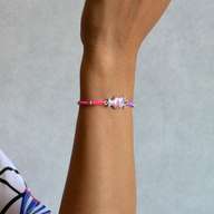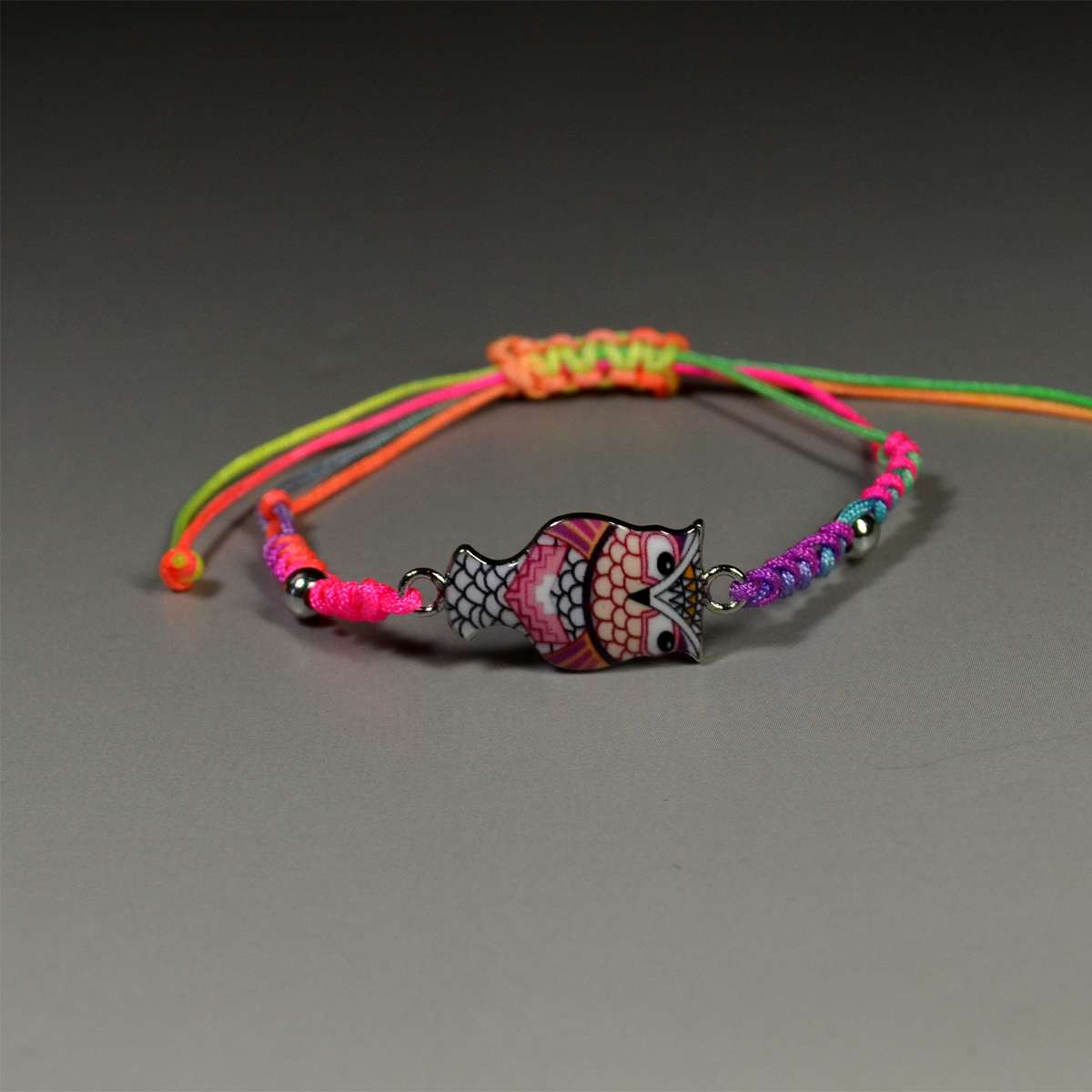 カラフルなミミズクを形どった扁平なメタルビーズをメインに使い、シルク紐で平編みで編み上げたブレスレットです。平編みで編まれている部分にシルバーボールビーズが配置されています。