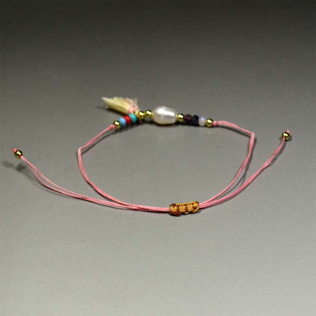 ブレスレット・パール&タッセル : MPT006 在庫数 単価 発注数 - + 備考 カートに入れる 重量: 約 2 グラム 楕円球形をしたパールビーズ(長さ約 10mm x 直径 約 7mm)を中央に配置し、小型タッセル(長さ 16mm)、カラービーズ(直径約 3mm)を片側 5個並べ、硬めのシルク紐を通した部会スレットです。ブレスレットの脱着は、テール部を操作して簡単にできます。ビーズが連なっている長さ:約 4cm 在庫数 単価 発注数 - + 備考 カートに入れる