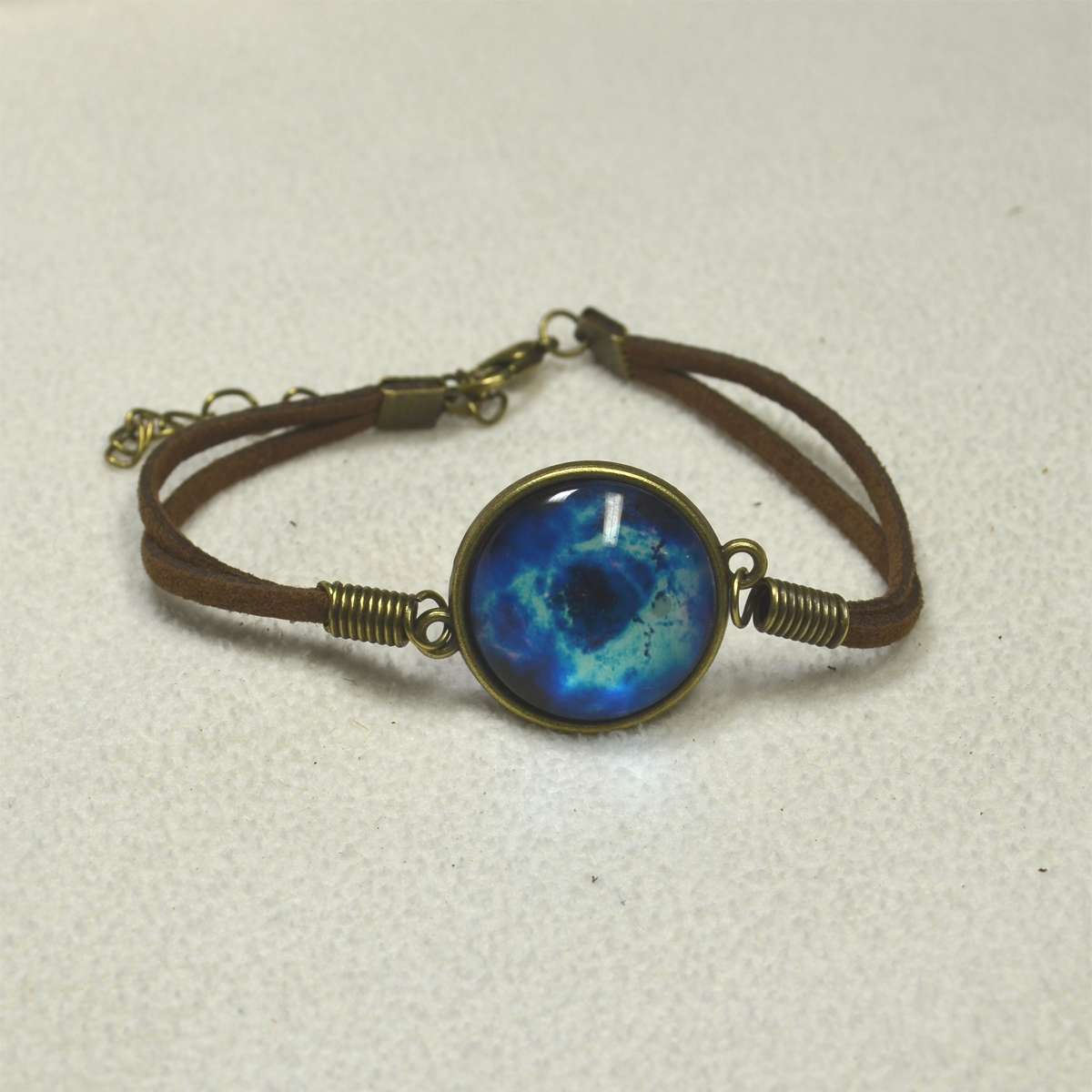 宇宙をイメージするような画像が描かれた、円形のレンズ状のガラスビーズをメインビーズとして、灰茶色のスエードひもで結び付けられたブレスレットです。