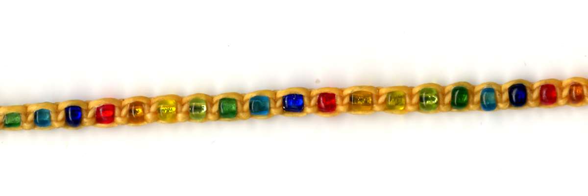 アンクレット・蝋引き紐・ガラスビーズ : AMC004 在庫数 単価 発注数 - + 備考 カートに入れる 価格: 330 円/ 個 (本体価格:300円+税:30円) 重量: 約 9 グラム 色: 卵色 蝋引き紐を用いて、ガラスビーズ(直径3~4mm)をグラデーションになるように、全周に並べ、編み上げたアンクレットです。先端部には輪があり、反対側にある円盤状のココナツビーズ(直径 8~9mm)で留めます。全長:23~23cm 幅約 5mm 在庫数 単価 発注数 - + 備考 カートに入れる