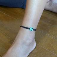 平和の印である、ターコイズブルー色のピースマーク・ビーズ(直径約 15mm x 厚み4mm)を中心に円盤状の黒色ココナツビーズ(直径 約 6mm)を両側にそれぞれ6個ずつ連ねて、黒茶色の蝋引き紐で編み上げたアンクレットです。