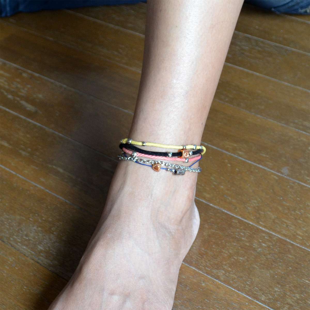 3本の比較的太いひも、1本の細い紐、1本のチェーンで構成されたアンクレットです。