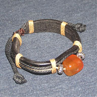 半透明上の赤茶色系の小石状のストーンビーズ(長さ18mm 幅14mm)をメインビーズとして中央部に、その両サイドにはに円盤状のシルバービーズ(幅3mm 直径7mm) が、のレザー革(幅約 11mm 厚さ約 3mm )のうえに、太さ約 2~3mm の紐で編まれています。