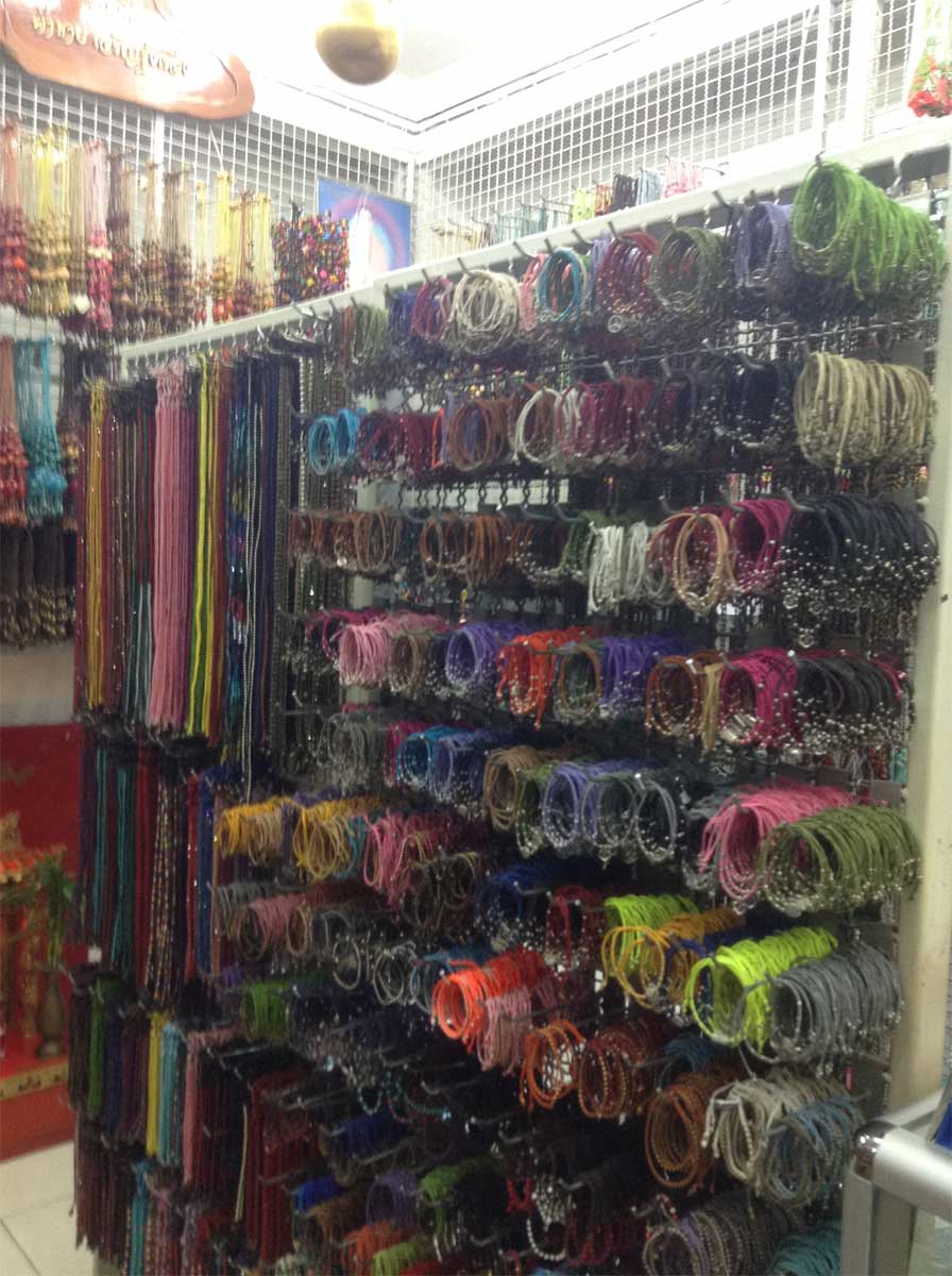 店内は、ブレスレット、アンクレットが種類ごとにまとめられて陳列され、天井近くまで並べられています。同じブロックにある商品は、同一の販売価格となっています。