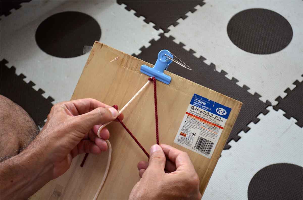 逆4字+逆4字結びは、二本のひもを使って、数字の「4」を鏡で見た時のように、逆の「4」の形をつくり、「4」の内側のスペースに、紐を通して結ぶ方法です。