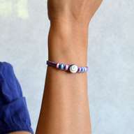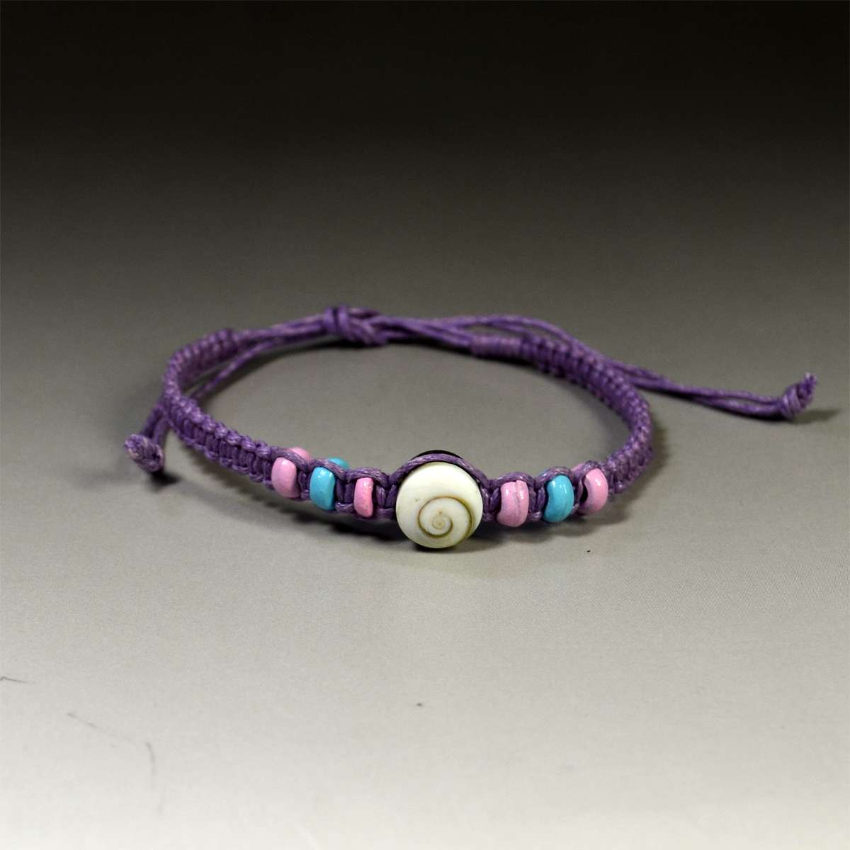 螺旋状の模様が特徴のサザエの蓋を利用した天然ビーズを中央に配置し、両サイドに円盤状のカラービーズ(幅約 3mm) を3個ずつ配置し、カラー・コットンコードで、平編みで編み上げたファッション・ミサンガです。