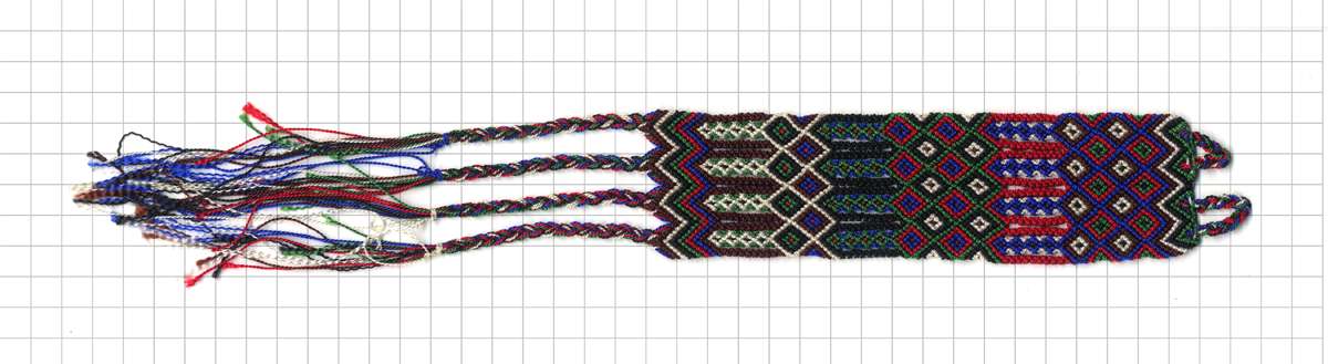 ワックスコーティングされたナイロンの紐を用いて、メキシコ独特の色使い、模様で編み上げた、ダブルサイズのダブルの扁平(ワイド)状のミサンガです。