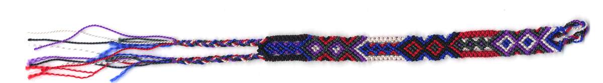 ワックスコーティングされたナイロンの紐を用いて、メキシコ独特の色使い、模様で編み上げた、扁平(ワイド)状のミサンガです。