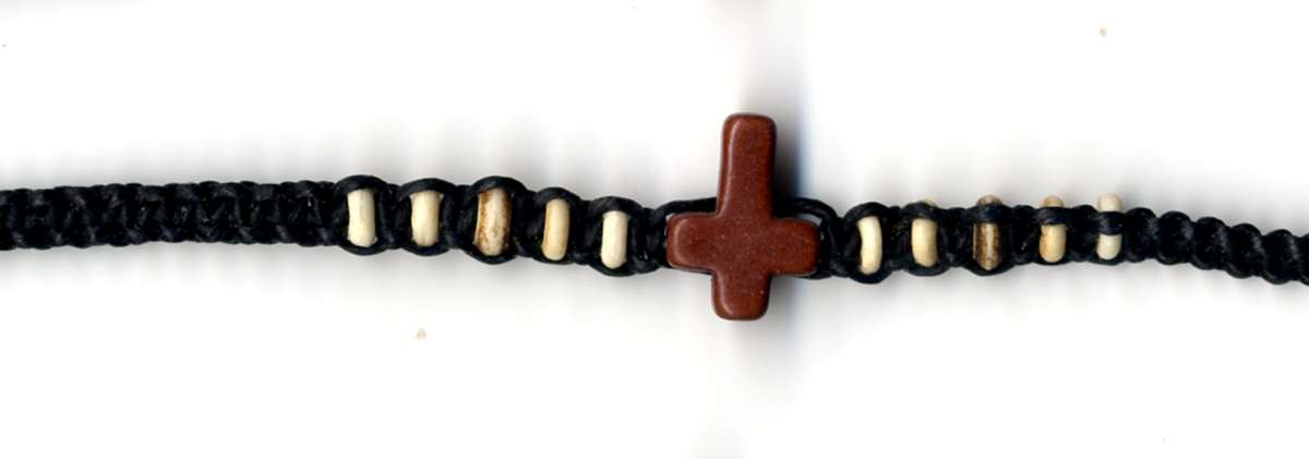 強化プラスチック製のクロスビーズをメインにし、両サイドに円盤状のカラービーズを配置し、蝋引き紐で平編みで編み上げたミサンガです。