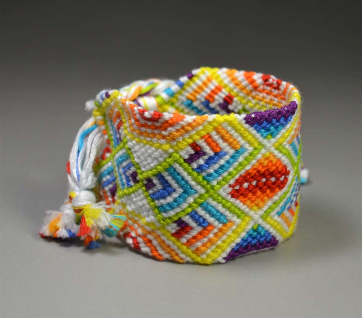 白色・赤色・橙色・杏色・黄色・黄緑色・浅葱色・青色・紫色のコットン紐を用いて緻密で繊細な模様を表現した幅広のミサンガがです。テールはそれぞれ2本ずつあります。テールとテールが細い紐で結ばれているので、脱着する際には、テールをスライドさせるだけで容易です。
