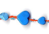 ハート型のターコイズ模様のプラスチック製のビーズ(長さ約13x幅15x厚3mm)とそれより小さなハート形のビーズ(長さ約8x幅8x厚3mm)、不定形のターコイズカラーのプラスチックビーズ(長さ約9x幅7x厚5mm)、ガラスビーズ(長さ2mm)をコットンコードを用いて編みこまれたミサンガです。
