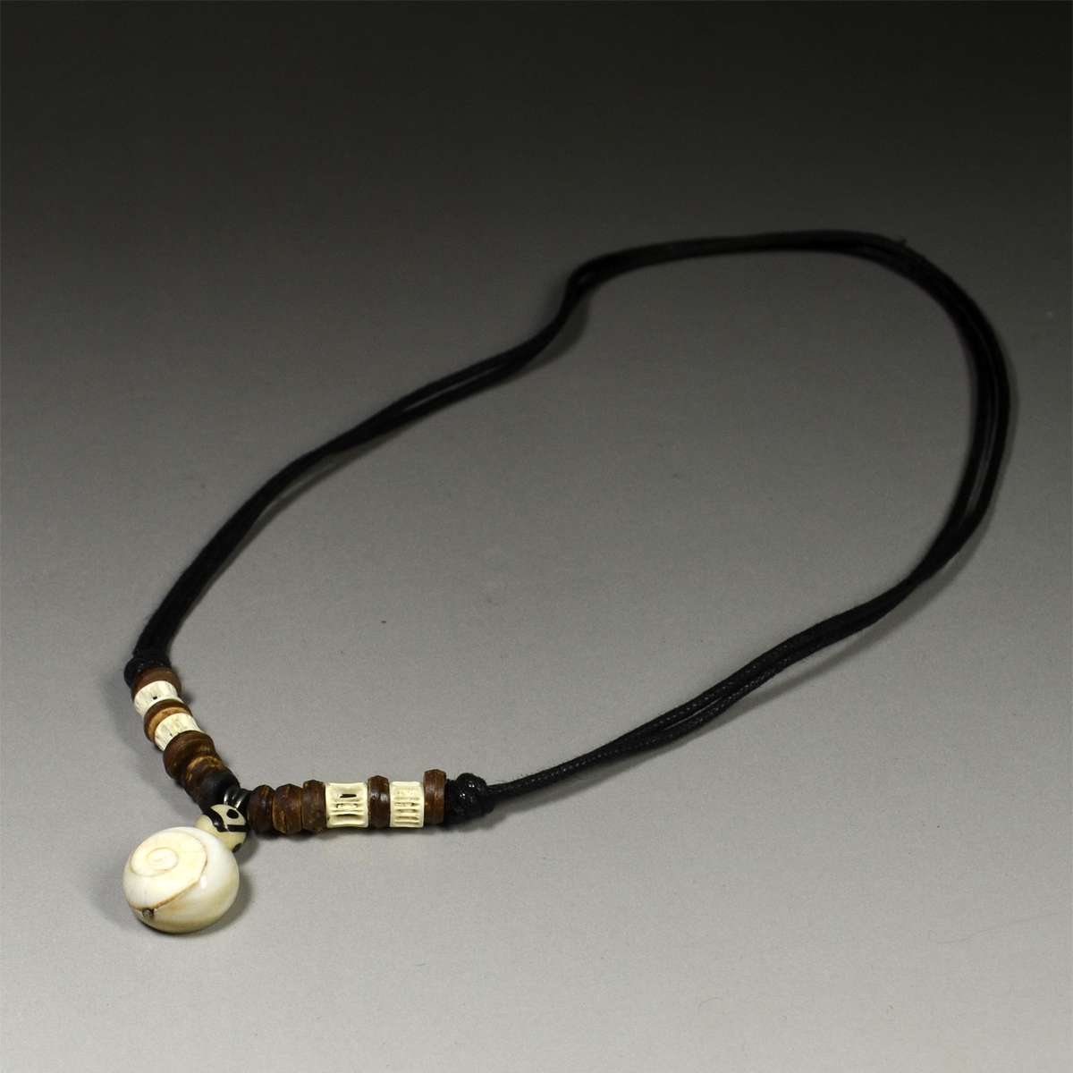 ペンダントトップは、貝の蓋をメインとして、その上に模様が描かれた球形のビーズ、さらに複数の円柱状のボーンビーズ、円盤状のココナツビーズ等で構成されています。
