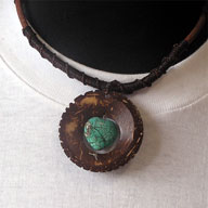 丸みを帯びたココナツを素材とした円盤板(直径約 5cm)の中に、円をくりぬき(直径 23mm)、穴の部分に、厚みを帯びたハート型のターコイズビーズ(幅 20mm x 高 20mm x 厚み 8mm)をつるしたトップで構成されたトップです。