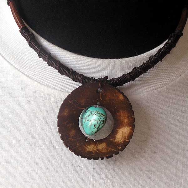丸みを帯びたココナツを素材とした円盤板(直径約 5cm)の中に、円をくりぬき(直径 23mm)、穴の部分に、厚みを帯びたハート型のターコイズビーズ(幅 20mm x 高 20mm x 厚み 8mm)をつるしたトップで構成されたトップです。